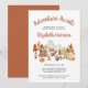 Rustiska hösttematiska duschinbjudningar till barn med vattenfärgade illustrationer av skogsdjur med tält och campingläger i bergen och skogen, fall och pumpor. "Äventyr Awaits" och "mor to be's namn" är skrivna i ett terracotta-manus.