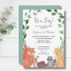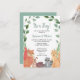 Familjen och vännerna i inbjudan för att fira de blivande föräldrarna med denna söta, vita vattenfärgsinbjudan. De här skogskamrarna, räv, tvättbjörn, skorpa och ekorre, är omgivna av rustiska grejer. Anpassa den här pojkens babyvisa inbjudan med ditt namn och information. Ursprunglig vattenfärg © Michele Davies.