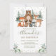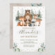 Vitmisk inbjudan till träfödelsedag med en bra vattenfärgad illustration av fyra skogsvänner: björn, räv, hjort och tvättbjörn