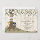 En inbjudan till babydusch med en illustration av en räv, en uggla och en tvättbjörn som står runt ett träd inlindat i banderoll som säger att "Välkommen Baby" Träd har exponerade rötter, grönt löv och svampar. Vit buntning ovanför anpassadet.