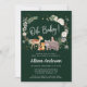 Kute rustik vinterduschinbjudan med vattenfärgade illustrationer av trädjur, blommigtar, gröna stjärnor och guld-stjärnor och snöflingor. "Åh Baby!" och mor-to-be's namn är skrivna i ljusgräddskript mot en mörk-jägare grönt bakgrund. Anpassa enkelt duschdetaljer.