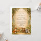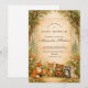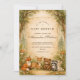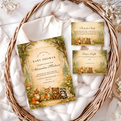 En hjärtvärmande skogsdesign med en söt samling skogsdjur under en mjuk sagobokstak. Räv, hjort, björn, tvättbjörn och kanin sitter tillsammans i en varm höstäng omgiven av milda träd och vintage-pergamenttoner. Den jordnära färgpaletten och de känsliga botaniska detaljerna skapar en mysig, nostalgisk känsla – perfekt för en naturinspirerad fest. Helt anpassningsbar för att göra den unik för dig.