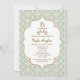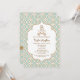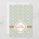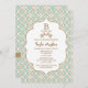 Elegant och vacker fransk marockansk inspirerad babyduschinbjudan med en upprepad blått blåskal, blek aqua, ljusblåaktig grönt teal och guld geometrisk mönster och blommigt med i guld. Denna storskaliga och lyxa tittar inbjudan är en perfekt för alla formella, exotiska, marockanska, arabiska nätter eller Aladdin-temade barndusch. Baksidan av den här anpassningsbarna kan inbjudningskorten i finare ram vara personlig med det första namnen av mamman som ska vara och händelseländerna i namn på quatrefolieformen och utskriven banderoll. Bild och design © Krissy H. Studios, LLC.Alla rättigheter förbehållna.
