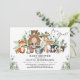 Fira din lilla vilds kommande ankomst med den här vismska skodoninbjudan till babyduschen. Utformningen har en grupp vackra skogskonvänner (hjort, björn, tvättbjörn, räv, skorpa, ekorre, skunk och uggla) och rustiska vattenfärgsgreer.