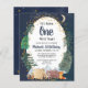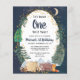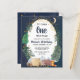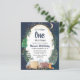 Budgetvänlig rustik inbjudan till 1-årsfest med söt illustration av skogslevande djur som tältar i bergen och skogen, en överlagring av guldstjärnor och måne på en nattlig himmel och "Det har varit ett vilt år!" i mörkblå nattskrift och typografi.