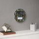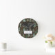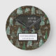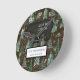 "Wood Bear Woodland Forest Pojke Birth Stats Round Clock." Bergsområden, land, rustik, lägger svarta björn över en bakgrund av mörk som regenererar träskivor med snöskogar, modern snyggt skog träd för ditt pojke-daghem. Skapat av den internationellt erkända licensierade konstnären och designern Audrey Jeanne Roberts, upphovsrätt.