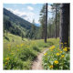 En fredlig, bildlig naturscen med en smutsig väg som lindar genom en lush gräs-skog, omgiven av levande gult vilda blommor. Den höga grönten träd sträckte sig mot himmel och spåret leder till avlägsna berg under ett starkt blå himmel med flytande vita moln. De gyllene blommorna ger en munter kontrast till grönten, skapar en lugn och uppfriskande stämning. Perfekt för naturen älskare, vandrare och alla som uppskattar utomhusskönhet.