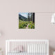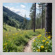 En fredlig, bildlig naturscen med en smutsig väg som lindar genom en lush gräs-skog, omgiven av levande gult vilda blommor. Den höga grönten träd sträckte sig mot himmel och spåret leder till avlägsna berg under ett starkt blå himmel med flytande vita moln. De gyllene blommorna ger en munter kontrast till grönten, skapar en lugn och uppfriskande stämning. Perfekt för naturen älskare, vandrare och alla som uppskattar utomhusskönhet.