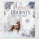 Ett vackert vattenfärgstryck med en trädbeläggning som har fem träd i den avstånd och snö täckte löv och koner i gräs i förgrunden som bildar en gräns kring mallar som kan vara personliger. Ett enda vackert lager står i snö och har silver grått löv med orange bär omkring sig. Den ordalydelse som lyder: Glästa Helgdagar från namn i din familj kan ändras till valfri hälsning.