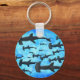 Skolan Hammerhead Sharks in Silhouette Button Keychain. Den vackra visionen underifrån som en skola av hajar på ett skonsamt sätt simma längs det öppna havets silhuggna från Sol ovan. Den artsy joys av nautiska natur, vilt, hav och den blå undervattensvärlden. En levande konst biet för alla som kärlek djur och hav.