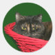 Sköldpadds- katt i en röd klistermärke för basketjulfoto
