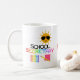 Skolsekreterare i regnbåge i färg med solglasögon i lycklig med kritor anteckning och blyertspenna.