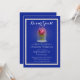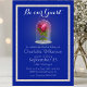 Denna Skönhet och odjuret temade festinbjudan har en vacker kunglig blå bakgrund med en vit glitterram. En förtrollande, magisk röd ros är placerad i mitten, innesluten i gnistrande glas. Frasen "Var vår gäst" är tryckt i en fantasifull, sagostil ovanför rosen.