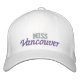 Visas i vitt med en broderad tvåtonstext [missen finns i något ljusare färg] i orkidéformat lila färger. Den här hatten visas med text längst fram namn i skönhetstävlingen, text bakåt visas med året och texten på sidan visas med stad och läge. Måste anpassa namn på detta lock [om du inte är Miss Vancouver] och komma ihåg att välja hatt/text färg.