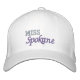 Visas i vitt med en broderad tvåtonstext [missen finns i något ljusare färg] i orkidéformat lila färger. Den här hatten visas med text längst fram namn i skönhetstävlingen, text bakåt visas med året och texten på sidan visas med stad och läge. Du måste anpassa namn på den här hatten [om du inte är Miss Spokane] och komma ihåg att välja hatt/text-färg.