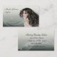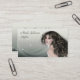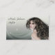 Visitkort med den härliga kvinnan med långt lockigt hår som ha på sig härlig makeup. Abstrakt grön lutningbakgrund, beklär och drar tillbaka. Perfekt för hårsalonger, sminkkonstnärer, cosmeticians eller mode.
