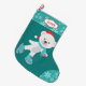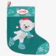 En ynklig vit polar-björn har roligtens is på framsidan av denna söta julstrumpa. Han har en röd strumpor och en blå halsduk. Bilden placeras på tealbakgrunden, och en teal och vit snöflinga mönster gräns ligger överst och tå. Ditt barns namn är på en röd, invändig vit banderoll på den översta snöflaken mönster gräns. Lagerhållningens baksida är samma teal och vit snöflinga mönster.