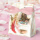vintage konst med målning av den klassiska sagolskönheten "skönhet och beast" är i en rosa klänning och rödkloak sitta på en stol framför bord och med en kopp te med beasten, en brunbjörn.