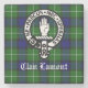 Skotsk klan Lamont vapensköldsemblem och text på tartanbakgrund.