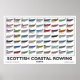 Den första skotska kusten, Rwing Skiff, inleddes i oktober 2009. De lokala samhällena har byggt på traditionellt sätt - klubbar för roddfiske längs kusterna har bildats för att samla in pengar, köpa kits, bygga och tävling dem. Fem år senare firar och visar denna poster alla de skidor som lanserats i Storbritannien fram till oktober 2014, och visar deras namn, startnummer, roterande färg och de klubbar de tillhör. Det är 84 båtar som tillhör 69 klubbar eller seglar i organisationer. Inte illa på fem år... Utomhavanden är snart tillgängliga