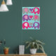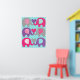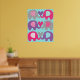 Elephant Love barnkammareaffisch visar sex elefanter i grått, rosa och lila med mönstrade öron på en tealblå prickig bakgrund!