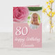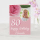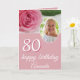 Skottrosfoton Blommig 80-årsdagskort. Kortet är rosa och har en vacker skottros och ett foto i en rund ram på framsidan och på baksidan av kortet. Texten är i ett trendigt vitt skrivsätt. Lägg till ditt namn, ålder och foto och meddelande inuti.