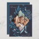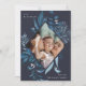 Elegant Hanukkah-fotokort för lodrät-foton innehåller ditt foto omgivet av en geometrisk gräns av isigens blå botaniska blad och små vita vattenfärgbär. "Joyous Hanukkah" visas i det övre lämnat hörnet i grått-lettering, med namn i den nedre högerna.