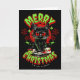 Rolig skräckinspirerad juldesign med en kuslig katt med röda ögon, dödskalle med orm, dekorationer och snöflingor.