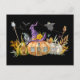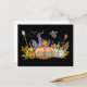 Ett vykort med en söt bild av ett hemskt pumphus med en stor häxhatt på toppen och spöken och fladdermöss som flyger runt.