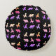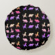 Färgglatt dinosaurie-mönster på skräddarsydd rund kuddöverdrag i borstat polyester. Svart bakgrund - lätt att anpassa.
