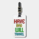 Baksidaen av denna anpassadedesign presenterar en vitsilhouette av ett flygplan på en svart bakgrund. Tillfoga ditt namn till texten för att personifiera denna bagagemärkre! Bekläda av denna chic design presenterar färgrik text som läser: "Ha att hänga lös ska reser". Denna unika bagagemärkre gör en underbar gåva för den flygvärdinna eller lotsar i ditt liv!