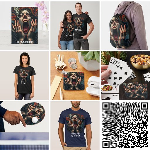 Skräm för Ice Cream Tormented Woman Haunting Skräm Dam T- Shirt. En konstig t-shirt. Lägg till detta på en manar unisex eller barn t-shirt. Anpassa den här mallen om du vill ändra bild- och textmeddelandet. Den här AI-bilden fångar en kvinnas plågade ansikte, som konfronteras med en blodig skrik, omgiven av fantastiskt inslag i en mörk, moody och oroande estetisk påminnelse om fantasykonst och Edvard Munchs verk.
