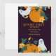 En lekfull Halloween-illustration fylld med vänliga spöken, pumpor och blommande vinrankor. En rolig blandning av skrämmande och botaniskt i en ren, vintage-stil. Samling inbjudningar med matchande kuvert.