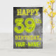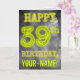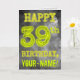 Framsidan på denna kusliga, redigerbara födelsedagstema grusskort design har meddelandet "GRATTIS PÅ 39-ÅRSdagen" med karaktärer som har ett kusligt lysande aura utseende, på ett mystiskt grått molnigt dis-inspirerat bakgrundsmönster. Framsidan har också ett personligt mottagarnamn. Insidan har ett anpassningsbart födelsedagsgratulationsmeddelande. Ett anpassningsbart födelsedagsgratulationskort som detta kan ges till någon som firar sin 39-årsdag.
