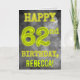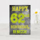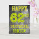 Framsidan på denna mystiskt utseende, redigerbara födelsedagskortdesign med födelsedagstema har meddelandet "GRATTIS PÅ 62-ÅRSdagen" med karaktärer som har ett kusligt glödande aura-utseende, på ett spöklikt grått molnigt dis-inspirerat bakgrundsmönster. Framsidan har också ett redigerbart mottagarnamn. Insidan har ett födelsedagsmeddelande som kan anpassas. Ett anpassat födelsedagsgratulationskort som detta kan ges för att fira någon:s sextioandra födelsedag. [~Z0000364]