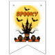 Denna flaggbanner visar orden "Skrämmande" i ett unikt trycktypsnitt med orangea bokstäver plus kusligt trädhus, jack o lanterns, fladdermöss och kyrkogård med andra skrämmande tema-dekaler i detta Halloween-tema och stil. Alla banners har enkelsidig utskrift utomhus säkra gjorda med robust plast polystyren och tjock plast-rep har (16) 5,5" x 8" svansklyvningsflaggor på en 6' lång snurra.
