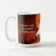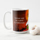 Denna Halloween-kaffekopp har en collage av en svart katt på en spöklik kyrkogård och ett spöke. Varje illustration som används i denna design klipptes ut från ett fotografi och sattes sedan manuellt som en överlagring. Använd den här muggen under hela Halloween-säsongen för daglig dryckesvaror eller för en fest.