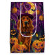 Omfamna Halloweenandan med denna förtrollande design med en söt hund i en häxhatt omgiven av utskurna pumpor. Perfekt för att lägga till en touch av skrämmande charm till dina festliga firanden.
