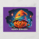Jag kom på att ha en jack o lykta som bär en födelsedags hatt med psykedeliska färger och jag gillade denna. Jag satte en kontur runt texten 'grattis på födelsedagen' så att den syns bättre. All text på designen kan redigeras. generativt innehåll.