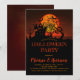 Skrämmande orange månljus natt bakgrundsbelysning ett träd och spökhus med lysande fönster på en kulle kyrkogård omgiven av svärmande fladdermöss Halloweenfest inbjudan. Betydande konstkredit till cocoparisienne via Pixabay. Sammansatt design av Holiday Hearts Designs.