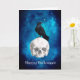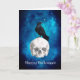 Designen har en korp på toppen av en vit kuslig skalle och en vacker klarblå skymd stjärnhimmel. Inuti kortet - Kuslig fladdermus flygande i vacker blå stjärnhimmel. Personlig med din egen text eller ta bort texten om du önskar lämna den tom (för handskriven text)