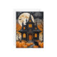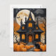 En kuslig silhuett av ett spökhus står mot en levande, fullmåne. Nakna, knotiga träd sträcker sig som skelettfingrar mot himlen, medan lysande jack-o'-lanternor prickar gårdsplanen. En svart katt, en välbekant ande för säsongen, sitter i förgrunden med ögon som reflekterar det kusliga ljuset. Konsten domineras av en slående svart och orange färgpalett, perfekt för att skapa en klassisk halloweenstämning.