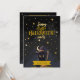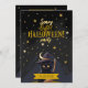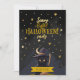 Stilfull svart katt Halloween-inbjudan med gyllene stjärnor, halvmåne och häxstämning – perfekt för eleganta kostymfester, spökliga soaréer och kattälskare.