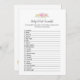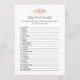 En roligt till babyduschen är Baby ord-skrampen. Det här spelkortet har rosa blommigtar högst upp. På motsatt sida lutar en nalle på en honungsfat som tittar på ett honungsbin med mallar.