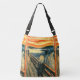 Skriet visar en något konstig tittar person med ett smärtsamt ansiktsuttryckanseende på en walkway med två folk i bakgrunden. Mörk - att virvla runt för blått bevattnar, och en brännhet röd och orange himmel är också delen av Munchs sammansättning.