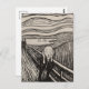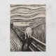 Skriet (1895), skapat av den norske konstnären Edvard Munch, är ett monokromt litografi av hans mest berömda verk. I denna svart-vita version behåller den skrämmande bilden den känslomässiga intensiteten i originalmålningen. Den centrala figuren, med sitt plågade ansikte och uppåtriktade händer, står på en bro med en turbulent, abstrakt bakgrund, som antyder en djup psykologisk plåga. De virvlande linjerna och djärva kontraster betonar figurens ångest och förkroppsligar universella teman som ångest och existentiell skräck. Denna litografiska version fångar det skarpa, råa känsloläget i originalet i ett mer förenklat, men lika kraftfullt, uttryck.