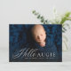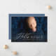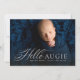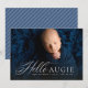 Det här födelsekortet med en bild har en elegant skrift "hello" bredvid ett namn eller smeknamn. Det innehåller också plats för barnets namn och andra detaljer längst ner på en horisontell bild. Den blå färgen på baksidan gör det perfekt för att tillkännage en söt babypojke och för att koordinera med nyföddafoton. Andra färger finns också tillgängliga.