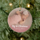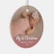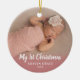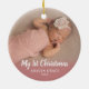 Denna runda julprydnad erbjuder en baby första jultema. Texten "Min första jul" visas i vitt ovanför fotot. Med Anpassningsbar kan du lägga till namn och år för ditt nyfödda barn.