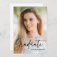 En modern skriptutexaminerad foto examensannonseringskort med modern skrifttyp, full bleed porträttfoto på framsidan med namn och klassinformation. Baksidan har ett andra foto med ytterligare detaljer. Om du är intresserad av en anpassad design, så är jag glad att skapa en personlig inbjudan till dig. Vänligen maila mig på susan@susannewberrydesigns.com.