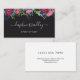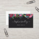 Svart affärskort för en bröllopsfixaren, evenemangsstilist, makeup artist, hårstilist eller liknande, med rosor, bär, löv och andra blommor i burgundi, blått, grönt, rosa och orange högst upp på kortet. Anpassa med ditt namn i ett charmerande vitt skript. På motsatt sida lägger du till kontaktinformationen i ett rent modernt teckensnitt.